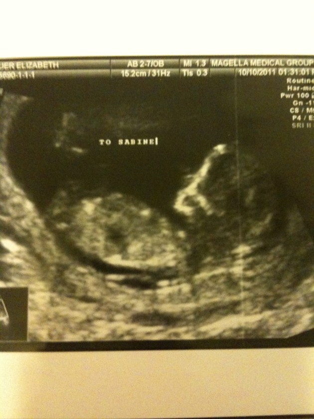 We had our 12 week ultrasound and got to see your beautiful little body. You were so still and sweet. Sabine came with us and she was excited to see you too. You lifted up your hand and waved to us. I got a picture of your profile and I look at it every day. You are so beautiful already.