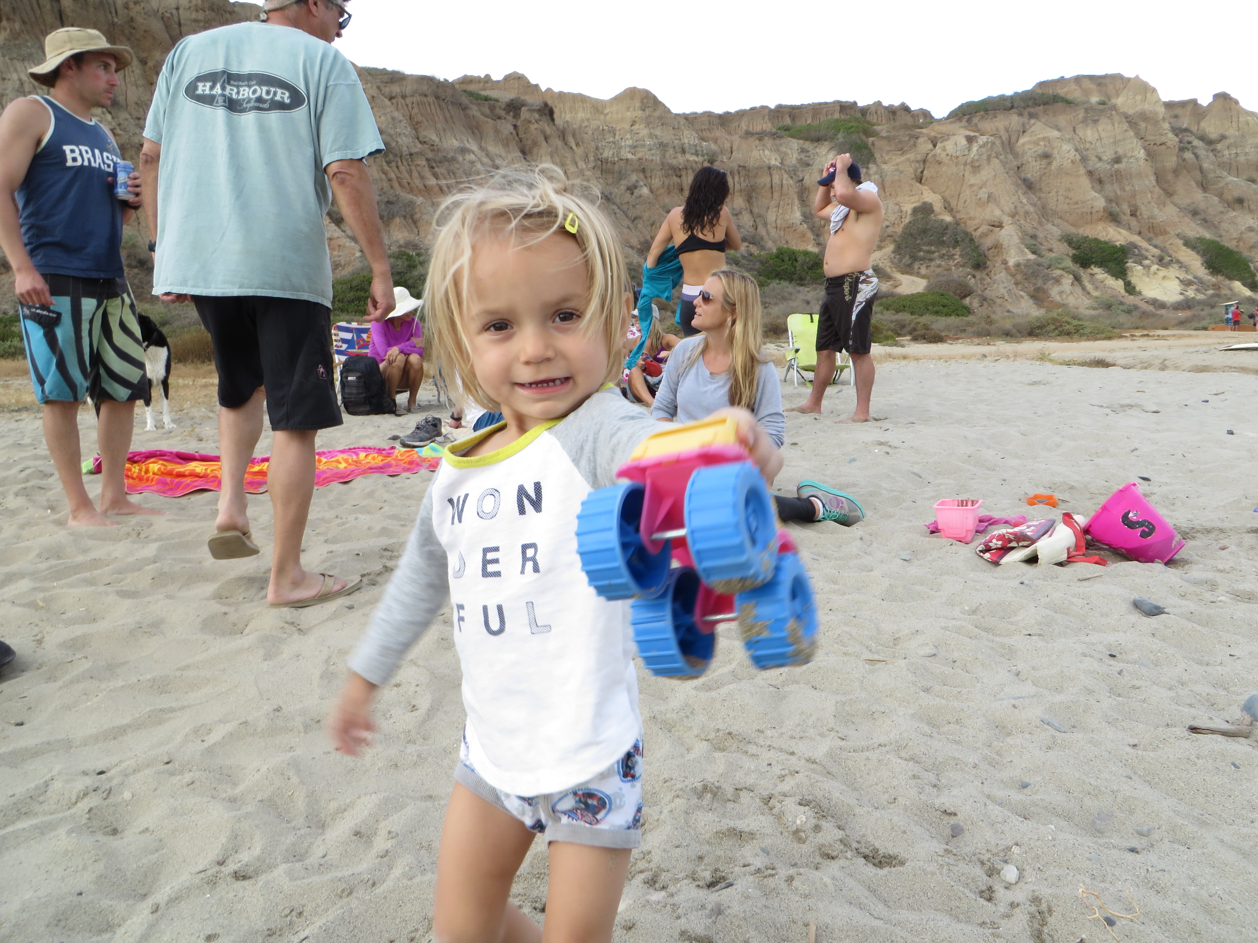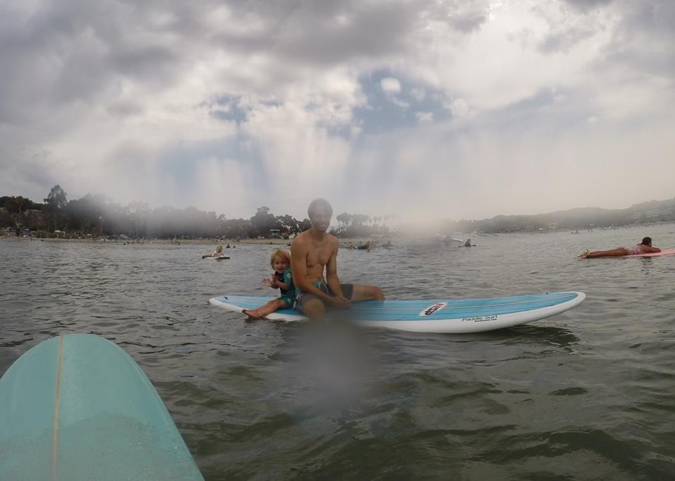 - (May)You are still nervous in and around the Ocean. We are working on that by taking you surfing and we think you are slowly improving. On the way to the beach you tell us how much you don’t like the beach and that you do not want to go surfing. Once you are out there though you love it. Then it comes time to catch a wave. You start crying as Daddy paddles for it but once you are up and cruising along you are fine again. We are hoping that making this a regular outing will help you get more happy and comfortable
