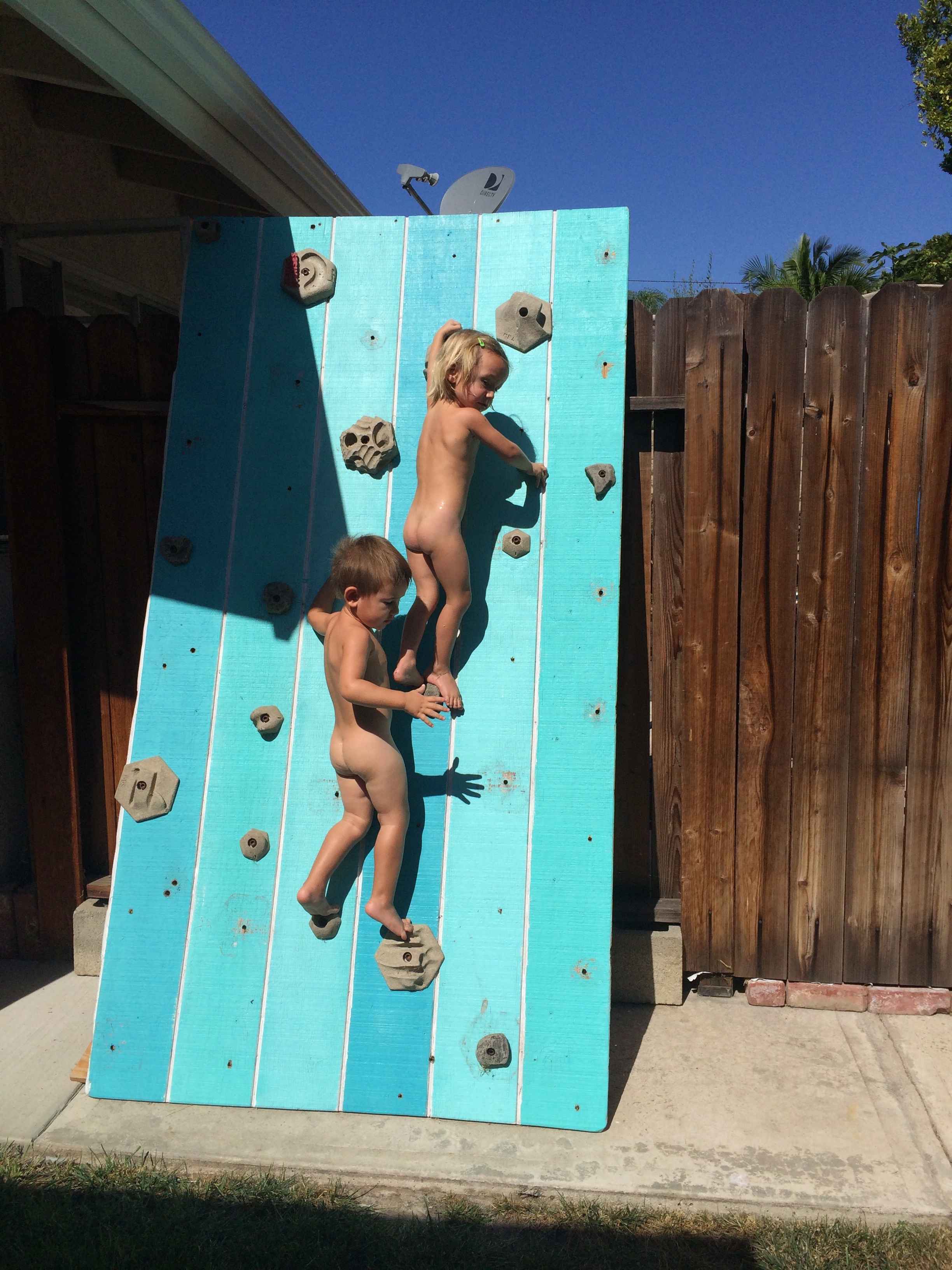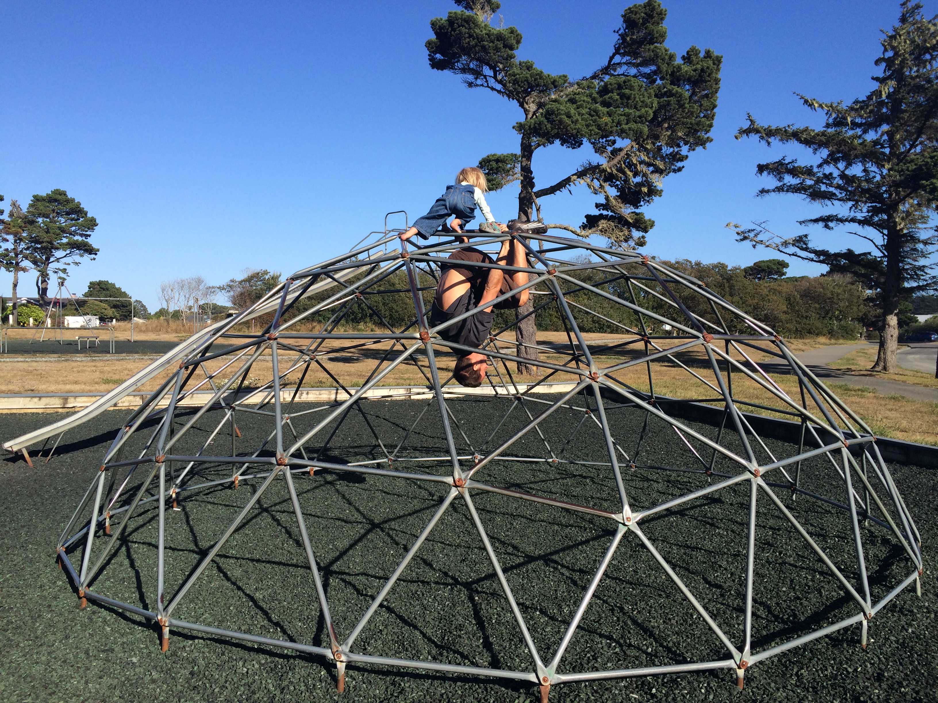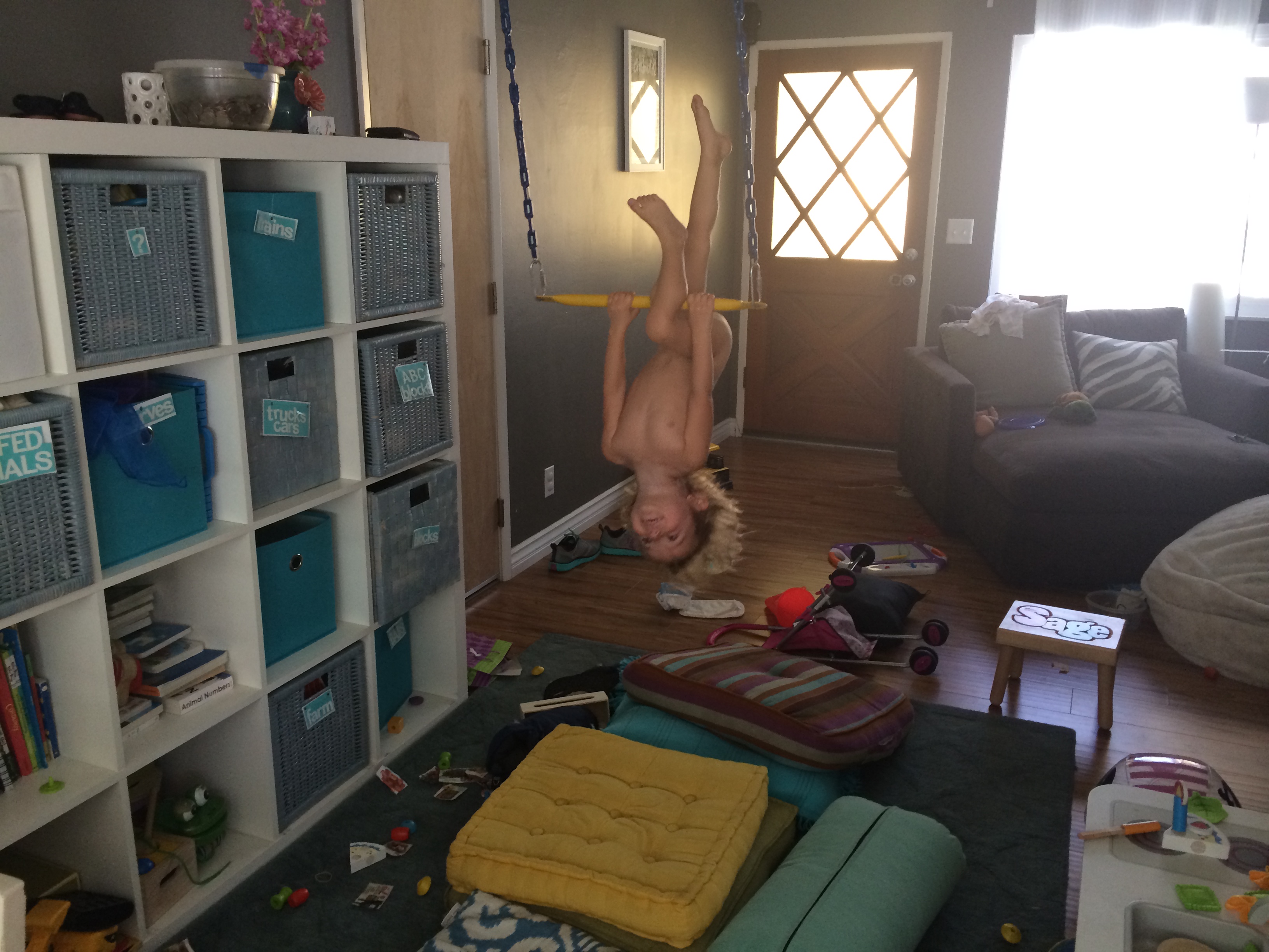 This is your preferred way of helping Daddy eat breakfast. You do this in our kitchen at home too. You are always climbing something.